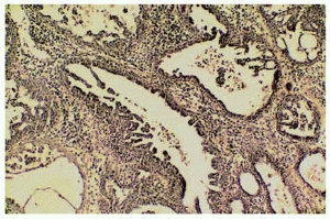 Fig. 5.--Detalle en el que se aprecian las características de la pared tubular, las proyecciones intraluminares, la secreción por decapitación y el denso infiltrado estromal de células plasmáticas (H&E x100).