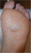 EAH usually manifests as a single brownish, blue, or reddish lesion. Multiple lesions can develop, usually in the distal areas of the extremities, palms, and soles.3 Most cases are asymptomatic, although some patients may experience hyperhidrosis and local pain caused by neural infiltration of the eccrine component.4
