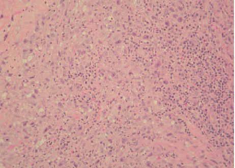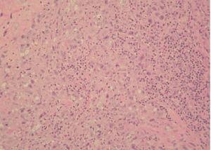 Fig. 3.Infiltrado inflamatorio acompañante con linfocitos, histiocitos y eosinófilos. (Hematoxilina-eosina, ×20.)