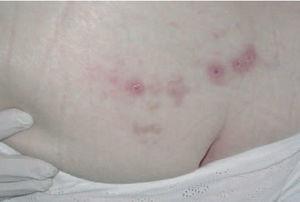 Fig. 1.Placas eritematosas infiltradas en la región lumbosacra.