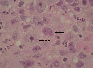 Fig. 2.Célula de Reed-Sternberg (flecha continua) y célula de Hodgkin (flecha discontinua). (Hematoxilina-eosina, ×100.)