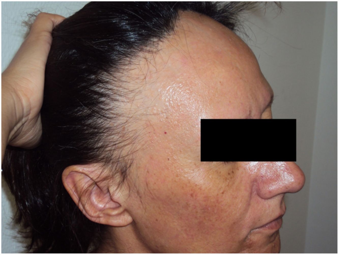 Existen varias series de casos publicadas en la literatura científica que recogen las características demográficas y clínicas de estos pacientes2–17. Este tipo de alopecia afecta con una mayor frecuencia a las mujeres posmenopáusicas, aunque también puede presentarse en mujeres premenopáusicas y, más raramente, en varones18,19. Produce un retroceso progresivo y generalmente irreversible de la línea de implantación anterior del cabello, y en muchas ocasiones pérdida del cabello de las cejas20. En la línea de implantación y en las cejas es frecuente observar signos de inflamación como eritema y descamación perifolicular. Existen 3 patrones descritos de retroceso de la línea de implantación (difuso, lineal y doble línea) que parecen tener repercusión pronóstica16. A veces, produce prurito o ardor. En algunos casos se pueden observar tanto pápulas faciales como una disminución del vello en otras áreas corporales como las axilas o el pubis14.