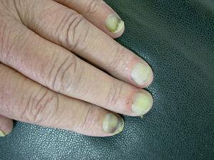Un paciente de 62 años de edad, sin otros antecedentes personales de interés, fue diagnosticado de carcinoma no microcítico de pulmón estadio IIIb (T4N2M0). El primer esquema terapéutico incluyó cisplatino y gemcitabina, pero no se objetivó mejoría tras varios ciclos de tratamiento. Posteriormente se administró epotilona a dosis de 32 mg/m 2 por ciclo. A los 4 ciclos, el paciente presentó dolor y parestesias en el extremo distal de los dedos de las manos. A la exploración se observaba una paroniquia dolorosa en algunos de los dedos, junto con lesiones hemorrágicas subungueales que originaban una coloración rojo-violácea difusa en la zona proximal de las uñas. Se pautó un tratamiento con paracetamol y mupirocina tópica. A los 4 meses, tras 7 ciclos de tratamiento con epotilona, el paciente había desarrollado una importante onicolisis, con movilidad de la lámina ungueal y supuración blanquecina subungueal (fig. 1). Algunas de las uñas mostraban una coloración blanquecina difusa, mientras que en otras aparecía un tinte hemorrágico distal. La sintomatología había aumentado, y el paciente refería dolor y dificultad para realizar las actividades de la vida diaria. En el cultivo efectuado del exudado creció Staphylococcus aureus. Se realizó tratamiento con cloxacilina oral además de la extirpación quirúrgica de alguna de las uñas.
