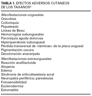 En el caso de las epotilonas su reciente aparición en el arsenal quimioterapéutico en seres humanos no ha permitido describir con detalle sus efectos adversos. Los trabajos y las series más amplias, pertenecientes a ensayos clínicos en fases I o II, han equiparado la frecuencia y el tipo de efectos secundarios al que se puede ver con los taxanos. De hecho, su mecanismo de acción es similar, al inducir una parada del ciclo celular tras estabilizar a los microtúbulos de las células neoplásicas. Los efectos adversos de los taxanos incluyen múltiples manifestaciones tanto cutáneas como ungueales (tabla 1). En nuestros casos, todos los signos y síntomas (onicolisis, hemorragias subungueales, paroniquia dolorosa y, finalmente, desprendimiento ungueal) ya han sido descritos con los taxanos, lo que quizá se explique por su mismo modo de actuación 4-8.