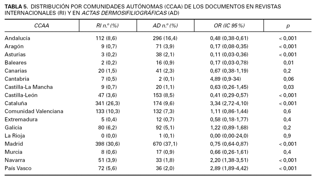 La tabla 5 recoge el número de documentos recuperados en RI y en AD por CCAA. Madrid y Cataluña fueron las CCAA que contaron con mayor número de documentos tanto en RI (30,6 % y 26,3 % respectivamente) y como en AD (37,1 % y 9,6 % respectivamente). Respecto a las publicaciones de las CCAA se observó un predominio en RI para Cataluña (p < 0,001), Navarra (p < 0,001) y País Vasco (p < 0,001). En cambio en la revista AD destacaban: Andalucía (p < 0,001), Aragón (p < 0,001), Asturias (p < 0,001), Castilla y León (p < 0,001), Madrid (p < 0,001), Baleares (p = 0,001) y Castilla-La Mancha (p = 0,03).