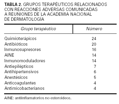 Se contabilizó un total de 2.220 comunicaciones, de las cuales 329 fueron de tema farmacológico clínico. De éstas, 182 correspondieron a casos clínicos relacionados con RAM, es decir, el 8,2 % del total de comunicaciones presentadas. Los fármacos implicados se hallan recogidos en las tablas 2 y 3, donde puede verse que los quimioterápicos anticancerosos, los antibióticos, los inmunomoduladores y los antiinflamatorios no esteroideos (AINE) fueron a los que más frecuentemente se imputó la causa de las reacciones adversas cutáneas descritas (tabla 4). Las reacciones eczematosas, las erupciones y el prurito fueron las más frecuentes. También se dieron a conocer reacciones adversas no cutáneas atribuidas a medicamentos que se habían utilizado para una enfermedad de la piel (tabla 5). En su mayor parte (53,3 %) los medicamentos implicados habían sido administrados por vía oral, si bien la vía tópica fue utilizada en una elevada proporción de pacientes (37,9 %).
