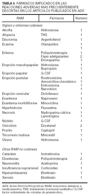 Los fármacos implicados y las reacciones detectadas se presentan en la tabla 6, en la que puede verse que, a pesar de la heterogeneidad de los cuadros descritos, las erupciones fueron el síntoma más frecuente. Hubo sólo un artículo en que se especificase haber comunicado el caso al centro de farmacovigilancia correspondiente.