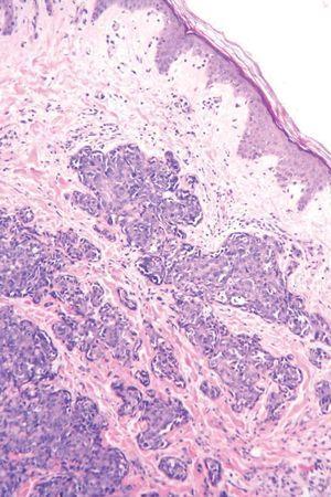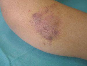 Mujer de 83 años, con antecedente de cáncer de mama y tratada mediante mastectomía y radioterapia. Como consecuencia del tratamiento desarrolló un linfedema en el miembro superior derecho, ipsilateral a la mama mastectomizada. A los 10 años de este tratamiento, apareció sobre el linfedema una placa eritematoviolácea de 5 cm de diámetro, bien definida e indurada (fig. 1). El examen histológico reveló que la lesión correspondía a un angiosarcoma (confirmado por técnicas de hematoxilina-eosina y técnicas de inmuohistoquímica (CD34 positivo). Se instauró un tratamiento con radioterapia, con buena respuesta. La paciente presenta una lesión residual y continúa en seguimiento por nuestra parte y el servicio de oncología.