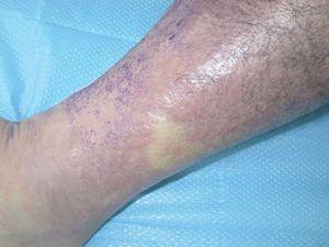 Varón de 42 años, intervenido a los 10 años de una lesión en la ingle derecha que el paciente definió como «lipoma» (no aportó informe anatomopatológico). A partir de dicha intervención desarrolló un aumento del diámetro de la extremidad inferior derecha (homolateral a la extirpación del lipoma), que se extendió al muslo y los genitales, siendo diagnosticado de linfedema secundario de miembro inferior derecho. Años después apareció una lesión eritematosa extensa y mal definida que abarcaba la mayor parte del territorio del linfedema, respetando pequeñas zonas como la raíz del muslo (figs. 2 y 3). En el diagnóstico histológico, la tinción de hematoxilina-eosina (fig. 4) mostraba pocas luces vasculares por tratarse de un angiosarcoma poco diferenciado. Por esta razón, el diagnóstico fue confirmado por las técnicas inmunohistoquímicas: citoqueratina negativa (que tiñe las células epiteliales, y por tanto esta neoplasia no está constituida por células derivadas del epitelio), vimentina positiva (que tiñe células tumorales) y CD34 positivo (este último marcador es diagnóstico, pues es específico del endotelio vascular del que deriva esta neoplasia) (fig. 5). Se realizó estudio de extensión (tomografía axial computarizada [TAC] toracoabdominal y resonancia magnética [RM] de miembro inferior derecho) que resultó negativo. Se inició un tratamiento con ifosfamida más adriamicina, recibiendo un total de cuatro ciclos. En la respuesta clínica se observó una disminución del edema y eritema. Se trató posteriormente con adriamicina liposomal con nula respuesta y desarrollando complicaciones como fenómenos isquémicos distales y sobreinfección. Debido a la mala evolución se decidió la amputación del miembro con desarticulación de la cadera e injerto en muñón. Actualmente se ha confirmado la progresión de la enfermedad con afectación cutánea, localizada en el flanco izquierdo y está recibiendo quimioterapia de segunda línea.
