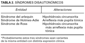 El diagnóstico diferencial con otros síndromes autonómicos no siempre es fácil 30,31, pues existe mucha interrelación entre ellos (tabla 2), y lo más probable es que se trate de variantes de la misma entidad. Así, el síndrome de Holmes-Adie asocia arreflexia con pupila tónica (sin hipohidrosis), pero en un estudio de 30 pacientes con este síndrome se encontraron áreas de hipohidrosis en 17 de los mismos, lo que los reclasificaría como síndrome de Ross 33. Del mismo modo, hablamos de síndrome del arlequín ante una hipohidrosis/anhidrosis segmentaria progresiva sin otras alteraciones asociadas, pero la patocronía del síndrome de Ross es variable, y puede iniciarse con la alteración de la sudoración, por lo que algunos síndromes del arlequín con el tiempo podrían desarrollar otras alteraciones que los reclasificarían como un síndrome de Ross 7,8. A pesar que algunos casos de síndrome de Ross presenten en alguna ocasión otra sintomatología vegetativa como hipotensión ortostática o impotencia, su distinción con otros síndromes disautonómicos más complejos, como el síndrome de Shy-Dragger o una pandiasautonomía aguda, no suele ofrecer dificultad. Finalmente, hay casos que padecen un síndrome disautonómico pero que, como el nuestro, en el que los reflejos eran normales, no cumplen estrictamente los criterios del síndrome de Ross 31. Sin embargo, no creemos que deban clasificarse como una entidad aparte, sino como un síndrome de Ross de expresión incompleta.