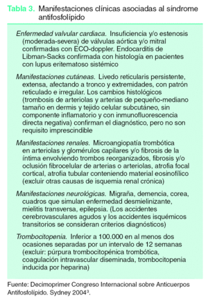 Se trata de manifestaciones clínicas muy frecuentes en el SAF y que fueron definidas en la reunión de Sydney 3. No se pueden utilizar para establecer un diagnóstico definitivo de SAF, pero en enfermos con criterios analíticos que no cumplan los clínicos, su presencia nos debe hacer pensar en un «probable SAF» (tabla 3).