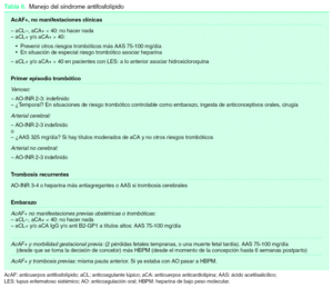 En los pacientes con un cuadro trombótico establecido, el pilar del tratamiento es la anticoagulación oral (AO). Sólo existe alguna discrepancia en torno a los niveles de la misma, y si debe ser o no definida en función del territorio afectado, si es un primer episodio, o es recurrente. La mayor controversia surge en torno al tratamiento preventivo en los pacientes con AcAF que aún no han desarrollado sintomatología clínica y las pautas durante el embarazo (tabla 6).