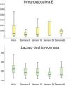 La LDH y la IgE disminuyeron durante el período estudiado (fig. 3). La LDH disminuyó comparando cada período estudiado: 234,12U/L (inicio) vs. 192,04U/L (semana 8), p=0,003; vs. 195,07U/L (semana 16), p=0,005; vs. 181,29U/L (semana 24), p=0,043; vs. 191,94U/L (semana 48), p=0,003. La IgE disminuyó principalmente desde el inicio hasta la semana 8 de tratamiento (1.274,06 vs. 647,80IU/mL, p=0,024). No se encontraron otros cambios analíticos.