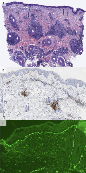 Se evidenció infiltrado linfocítico inflamatorio perivascular y presencia de mucina intersticial en el 100% (34/34) de las muestras (tabla 2). Se observó compromiso leve de la unión dermoepidérmica con vacuolización focal de la capa basal en el 14,7% (5/34) de los casos. Se realizó estudio inmunohistoquímico de CD123 en 29 muestras, reflejando positividad en el 75,9% (22/29) de los casos. Se realizó IFD en el 64,7% (22/34) de los casos, resultando positivo el 31,8% (7/22) de los mismos. Los patrones más comunes observados fueron depósito homogéneo de IgG y depósito granular de C3 en la membrana basal (5/7).