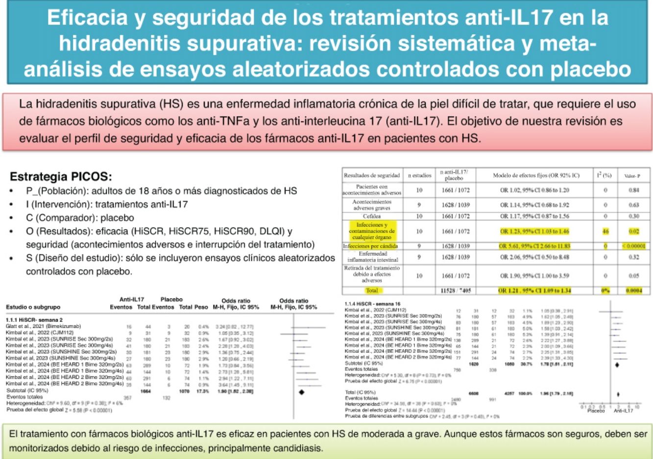 ConclusionesEl tratamiento con fármacos biológicos anti-IL17 es eficaz en el manejo de los pacientes con HS moderada-grave. Aunque estos fármacos son seguros, deben ser monitorizados debido al riesgo de infecciones, principalmente candidiasis.