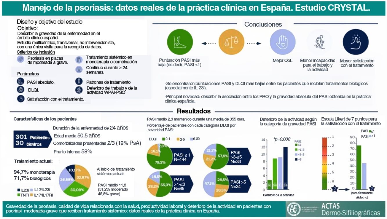 El estudio CRYSTAL, realizado en una cohorte de 301 pacientes españoles con psoriasis crónica en placas de moderada a grave que recibían un tratamiento sistémico continuo durante al menos 24 semanas, mostró una puntuación PASI absoluta media de 2,3 en el momento del estudio. El aumento de la gravedad de la enfermedad se asoció con un mayor efecto negativo sobre la CVRS y el deterioro de la actividad, medidos por DLQI y WPAI, respectivamente. La principal novedad del presente estudio fue describir la asociación entre las PRO y la severidad absoluta del PASI obtenida en la práctica clínica española.