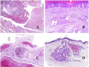 A) Malformación linfática. El vaso linfático dismórfico aparece dilatado en la dermis papilar. Esta presentación se denominó en el pasado como «linfangioma circunscrito» (hematoxilina-eosina ×20). B) Malformación linfática. Las válvulas son evidentes en algunos de los vasos linfáticos dismórficos (hematoxilina-eosina ×20). C) Malformación linfática. Vasos linfáticos dismórficos, algunos de ellos con sangre. También se ve una válvula en uno de los vasos. El infiltrado linfocítico estromal también es una característica común (hematoxilina-eosina ×40). D) Área hemorrágica además de una malformación linfática. Este es un fenómeno frecuente debido a la baja resistencia de la pared linfática para mantener la sangre dentro del vaso. Las hemorragias de larga duración a veces pueden dar lugar a depósitos hemosideróticos (hematoxilina-eosina ×20).