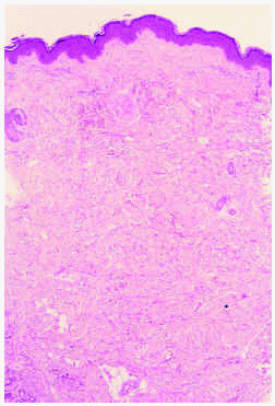 En el examen histopatológico se observa una epidermis normal, con una acumulación en la dermis de colágeno maduro y compactado, con ausencia de cambios inflamatorios, lo cual es compatible con nevos del tejido conjuntivo.