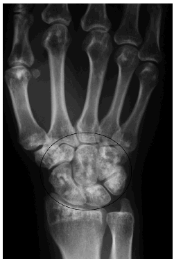 Fig. 4.--Lesiones óseas escleróticas en muñeca y mano de la madre del paciente.