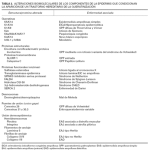Los estudios en genética y biología molecular han experimentado sustanciales avances en los últimos años, materializándose en el denominado Proyecto Genoma Humano, un proyecto de investigación cooperativa internacional que ha permitido la secuenciación completa del genoma humano y el desarrollo de la medicina biomolecular. El progreso en este campo ha sido particularmente significativo en el estudio de las genodermatosis, y ha puesto de manifiesto la importancia de la integridad funcional y morfológica de la epidermis para el mantenimiento de la homeostasia cutánea. En este artículo se estudian los hallazgos biomoleculares más recientes referidos a los trastornos estructurales y metabólicos de los queratinocitos y las uniones intercelulares, mencionando los genes alterados y/o las proteínas defectuosas que las condicionan. Existen otras enfermedades que pudieran incluirse en este trabajo, pero resulta imposible detallar todas ellas. Es importante advertir que, aunque en este artículo hemos tratado de consignar los datos científicos más recientes, la medicina biomolecular es una disciplina en constante evolución, por lo que alguna de las conclusiones expuestas pueden sufrir modificaciones importantes más adelante.