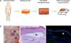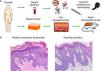 Modelización de enfermedades cutáneas de alta prevalencia. (A) Modelo humanizado de psoriasis basado en la inyección intradérmica, en la piel humana regenerada, de subpoblaciones de células T diferenciadas a un fenotipo T1 junto con la inyección de citoquinas de tipo Th17, (IL-17 e IL-22) seguido de la eliminación/perturbación mecánica del estrato córneo mediante tape-striping. (B) El modelo recapitula las principales características fenotípicas de la enfermedad tales como elongación y fusión de los puentes interpapilares, paraqueratosis, aumento de la vascularización y capilares dilatados, entre otras (H&E, 20×).