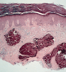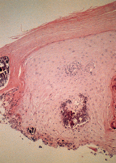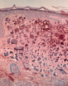 Histopatológicamente se observa material calcificado en la dermis superior en forma de masas homogéneas o agregados de glóbulos cálcicos rodeados por un infiltrado inflamatorio más bien escaso formado por macrófagos, células gigantes y mastocitos (Fig. 8). La epidermis suele ser hipertrófica y ocasionalmente puede mostrar fenómeno de eliminación transepidérmica (Fig. 9).
