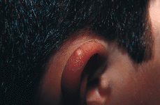 Clínicamente se manifiesta en forma de pápulas o nódulos cupuliformes de coloración blanquecinamarillenta y superficie lisa, verrugosa o mamelonada. Su consistencia es dura y en general no sobrepasan los 10 mm de diámetro. Habitualmente únicos, suelen localizarse en la cabeza --especialmente en las mejillas (72) (Fig. 5) u orejas (71-75) (Fig. 6)-- y menos frecuentemente en las extremidades (66) (Fig. 7); excepcionalmente se le ha descrito en la boca afectando gingiva o lengua (nódulo calcificado mucoso) (76) o en el pene (77). Por lo general hacen su aparición durante la primera infancia, aunque pueden ser congénitos o aparecer incluso en población geriátrica (78).