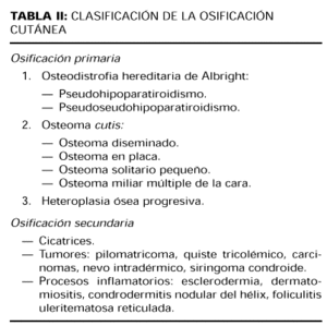 Las osificaciones cutáneas se dividen en primarias y secundarias (tabla II). Las formas primarias son muy infrecuentes y no se detecta en ellas alguna lesión cutánea previa; también se las denomina osteoma cutis, osteomatosis cutis u osteosis cutis. Las formas secundarias no son tan raras y se las puede encontrar en cicatrices quirúrgicas, enfermedades del colágeno y algunos tumores; en ellas la formación de hueso se produce por metaplasia de una lesión preexistente.
