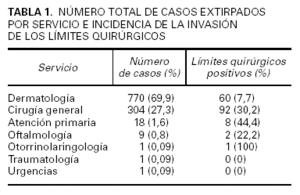 El número total de cánceres extirpados fue de 1.104, que corresponden a un total de 1.067 pacientes. De los 1.104 CCNM extirpados, en 163 (14,7 %) los márgenes estaban afectados. En dermatología se extirparon 770 cánceres (69,9 %), de los cuales 60 (7,7 %) tenían márgenes positivos; en cirugía general, 304 cánceres (27,3 %), de los cuales 92 (30,2 %) tenían márgenes positivos, y en atención primaria, 18 cánceres (1,6 %), de los cuales 8 (44,4 %) tenían márgenes positivos. Los datos más relevantes se recogen en las tablas 1 y 2.