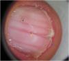This dermoscopic pattern should not be confused with other types of leukonychia or erythronychia that occur in other diseases. For example, onychopapilloma can present as a single longitudinal band of leukonychia or erythronychia and some glomus tumors present as a single longitudinal band of erythronychia that does not reach the distal border.3,4,6 Darier disease should also be distinguished from transverse leukonychia, whether true (trauma-associated) or apparent (generally associated with systemic diseases),3,4 and, above all, from other causes of polydactylous longitudinal erythronychia such as lichen planus, primary amyloidosis, graft-versus-host disease, and acantholytic epidermolysis bullosa.3,6