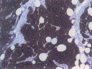 Fig. 6.—Citoqueratinas AE1/AE3. Motas perinucleares. (Hematoxili-na-eosina, ×200.)