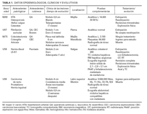 Los 4 pacientes con lesiones nodulares fueron tratados con cirugía. Dos de ellos presentaron recidivas que fueron posteriormente extirpados. La otra paciente ingresó por disfagia secundaria a las adenopatías submaxilares. Cuando se le iba a realizar estudio de extensión, falleció debido a una neumonía por estafilococo dorado resistente a meticilina. Sólo un paciente recibió terapia adyuvante con quimioterapia (6 ciclos con carboplatino y etopósido durante 4 meses) y seguidamente radioterapia (50 G en 20 sesiones durante mes y medio en región pélvica).