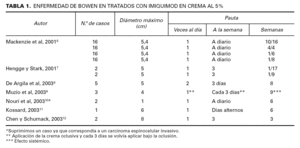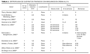 Por último proponemos, en base a nuestra experiencia y dado que en la revisión realizada no se plantea una pauta estandarizada, para la enfermedad de Bowen la pauta de imiquimod en crema al 5 % una vez al día, cuatro veces a la semana, durante 8 semanas y para la eritroplasia de Queyrat, una vez al día, tres veces a la semana, durante 4 a 6 semanas.