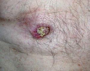 Fig. 3.Caso 2. Lesión papilomatosa en mama derecha con nódulo fuertemente indurado que borra parcialmente la areola mamaria.