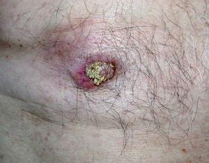 Un paciente varón, de 90 años, sin antecedentes familiares de interés y entre cuyos antecedentes personales destacaban: obesidad, hipertensión arterial, diabetes mellitus tipo 2, hiperplasia prostática, infecciones urinarias y cólicos nefríticos de repetición, insuficiencia renal terminal, aleteo auricular, tuberculosis y accidente cerebrovascular hacía más de 30 años, que presenta en la actualidad insuficiencia cardiaca y anasarca. Durante el ingreso se realizó consulta por una lesión papilomatosa en la mama derecha de años de evolución y de carácter asintomático, constituida por un nódulo fuertemente indurado que borraba parcialmente la areola mamaria (fig. 3). Se practicó biopsia cutánea en la que se observó una infiltración de la dermis profunda por un carcinoma pobremente diferenciado compatible con origen en carcinoma ductal infiltrante de glándula mamaria (fig. 4). El estudio de extensión realizado no mostró datos de interés. No se realizó ningún tipo de tratamiento por decisión familiar, dada la situación terminal del paciente.