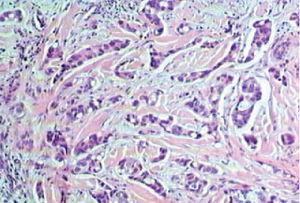 Fig. 4.Caso 2. Infiltración de la dermis profunda por carcinoma pobremente diferenciado, compatible con origen en carcinoma ductal infiltrante de glándula mamaria. (Hematoxilina-eosina, ×100.)
