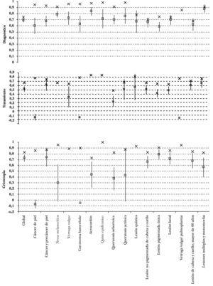 Figura 1. Concordancia entre dermatólogo y médico de familia en distintas categorías, calculada con el estadístico kappa. D: dermatólogo; MF: médico de familia; x: acuerdo simple; ¿: kappa e intervalo de confianza 95 % (si aplicable).