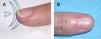 Figura 6.Extirpación quirúrgica «a ciegas» mediante el abordaje transungueal. A. Se señala el punto doloroso que se ha localizado mediante test de Love. B. Tras anestesia troncular se levanta un colgajo del eponiquio mediante dos incisiones laterales.
