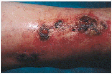 Fig. 1.--Lesión verrucosa de 6 x 4 cm de superficie queratósica, con áreas ulceradas y exudativas. Se observan tres lesiones satélites en la parte más proximal de la lesión inicial.
