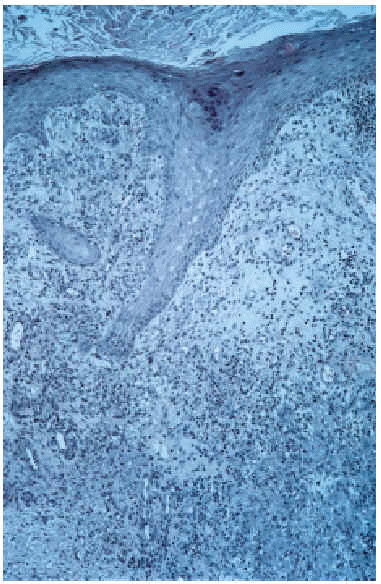 Fig. 2.--Hiperplasia epidérmica pseudoepiteliomatosa con intensa reacción inflamatoria de tipo granulomatoso en toda la dermis, constituida por células epitelioides, gigantes multinucleadas, plasmáticas y neutrófilos (hematoxilina-eosina, x40).