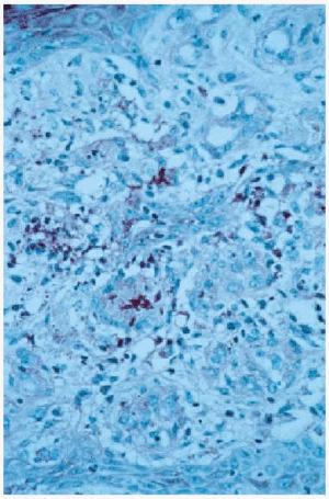 La cromomicosis da lugar a una serie de respuestas en el tejido afectado con objeto de eliminar la infección, que en la mayoría de los casos no resultan eficaces, por lo que el proceso tiende a cronificarse. En el estudio histopatológico de las lesiones habitualmente se observa una hiperplasia epidérmica pseudoepiteliomatosa con fenómenos de eliminación transepidérmica del hongo y, bajo ella, una reacción inflamatoria de tipo granulomatoso en dermis y/o tejido celular subcutáneo13, 16. La histopatología de la cromomicosis se caracteriza por la presencia de los «cuerpos escleróticos», localizados tanto en el interior de células gigantes como en el tejido extracelular o en microabscesos de eliminación transepidérmica13.