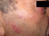 Varón de 74 años (español, sin viajes fuera de España) diagnosticado de anemia refractaria con exceso de blastos tipo 1 (AREB 1) un año antes, remitido por lesiones cutáneas acompañadas de artralgias sin artritis franca. Consistían en placas eritematosas de 2-3cm en una mejilla, frente y cuello, con sensibilidad, vello y sudoración conservadas (fig. 4). Tres meses antes había presentado lesiones similares un mes después de un primer ciclo de azacitidina, con resolución completa con 0,5mg/kg/día de prednisona. La biopsia cutánea mostró un infiltrado inflamatorio perivascular superficial, profundo y perianexial de linfocitos maduros, sin atipia, acompañado de granulomas histiocitarios intersticiales, sin necrosis (fig. 5), escasos eosinófilos, células gigantes multinucleadas y, focalmente, degeneración vacuolar de la basal y queratinocitos necróticos. Tampoco se observaron cuerpos intracitoplasmáticos ni cuerpos extraños con microscopia normal o luz polarizada. Los cultivos y los test serológicos para sífilis y VIH fueron negativos. Se realizó tinción inmunohistoquímica para CD15, marcando un escaso número de células; la inmunofluorescencia directa (IgG, IgM, IgA, C3 y fibrinógeno) y la tinción de Ziehl-Neelsen también arrojaron un resultado negativo. En la analítica sanguínea, además de los datos propios de su mielodisplasia, destacaron una PCR de 16,7mg/dl y una VSG de 88mm, con el resto de parámetros normales (anticuerpos antinucleares, anti-DNA nativo, anti-ENA, complemento C3 y C4). Como en el caso anterior, no se realizaron estudios moleculares para descartar leishmaniasis. Las lesiones se resolvieron al mes sin tratamiento y no volvieron a aparecer con los sucesivos ciclos de azacitidina. Tres años después su trastorno mielodisplásico se ha transformado en una leucemia mieloide aguda.