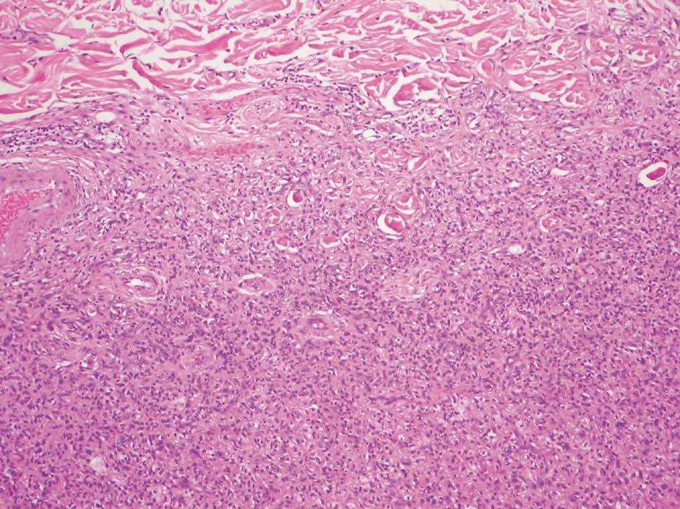 Figura 3. Periferia de la lesión con células fusocelulares entremezcladas con haces de colágeno engrosados (Hematoxilina-eosina, x100).