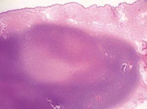 El diagnóstico histológico fue compatible con un dermatofibroma xantomatizado, siendo, por su gran tamaño, compatible clínicamente con un dermatofibroma gigante.