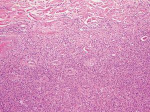 Un varón de 52 años con antecedentes de etilismo crónico en tratamiento con Antabús consultó por una lesión tumoral en su hombro derecho de 6 años de evolución. Al parecer, había sido extirpada de forma incompleta 3 años antes por un cirujano sin diagnóstico histopatológico y con la sospecha clínica de un quiste epidermoide. Desde entonces, la lesión había sufrido un crecimiento progresivo sin ocasionar molestias. El paciente no recordaba ningún antecedente traumático en la zona. A la exploración se observó un tumor exofítico de 6 x 4 cm de diámetro de superficie brillante y coloración eritematoviolácea, presentando áreas más parduzcas y amarillentas y alguna telangiectasia (fig. 1). La lesión estaba bien delimitada y a la palpación era gomosa, no pareciendo estar adherida a planos más profundos. Se realizó una resonancia magnética de la zona que reveló una tumoración adyacente al músculo trapecio sin signos de infiltración del mismo. Bajo anestesia local se realizó la exéresis quirúrgica de la lesión.