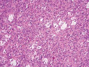 Figura 4. Presencia de células xantomatizadas rodeadas de un estroma muy denso. (Hematoxilina-eosina, x200.)