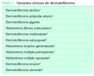 El dermatofibroma es una lesión benigna de estirpe fibrohistiocitaria muy frecuente que suele aparecer en adultos jóvenes con predominio en el sexo femenino. La forma clínica más frecuente es la de un nódulo solitario asintomático de pocos milímetros y color parduzco con predilección por los miembros inferiores. A la palpación suele ser desplazable sobre planos profundos y es típico el signo del hoyuelo cuando se comprime lateralmente. No obstante, existen otras formas clínicas de presentación, que se resumen en la tabla 1.