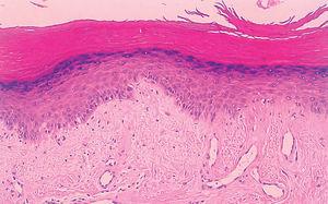 Fig. 3.--Hiperqueratosis, acantosis y vacuolización de la membrana basal, con leve infiltrado linfohistocitario perivascular superficial. (Hematoxilina-eosina, x100.)