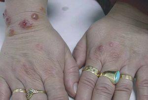 Figura 1. Ampollas de contenido hemorrágico y distribución lineal en la muñeca derecha. Lesiones papulovesiculosas de pequeño tamaño en dorso de ambas manos.