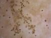 Dermoscopic findings in Pelagia noctiluca stings. Brown “Chinese characters” pattern. Brown dots appear connected by lines (*) composed of a fine light brown granular pigment, resembling Chinese letters. Clinical presentation corresponded to linear vesicles regularly spaced due to the contact with the “warts” contained in the oral arms of Pelagia noctiluca.